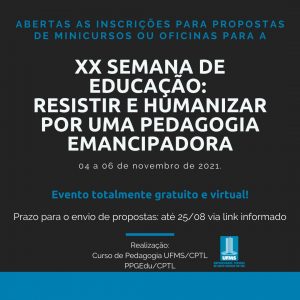 Abertas as inscrições para propostas de Minicursos ou Oficinas para a “XX Semana de Educação: Resistir e humanizar – por uma pedagogia emancipadora” – 04 a 06 de novembro de 2021.